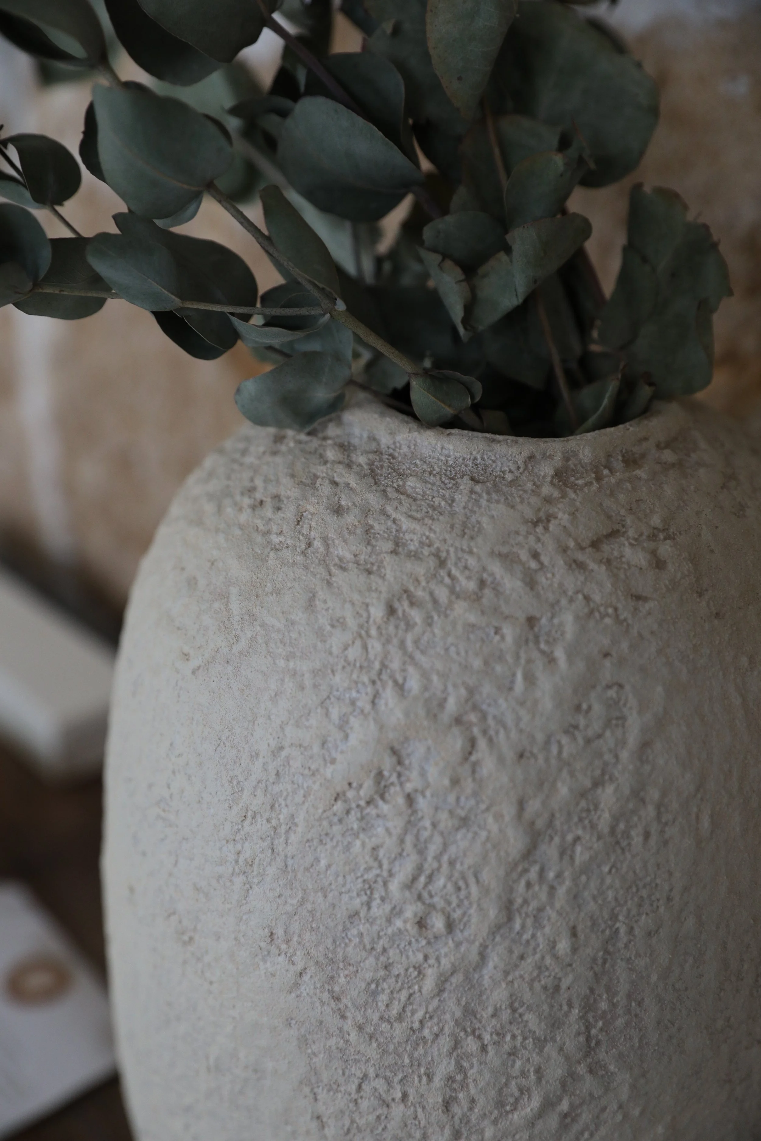 Originally a glas vase in bright blues and greens, now transformed into a deeply textured, yet simple and calming one-of-a-kind. Whether you choose to put in dried eucalyptus, some old thin branches from the forest or just let be as it is, it will definitely be an eye-catcher to your cozy home.