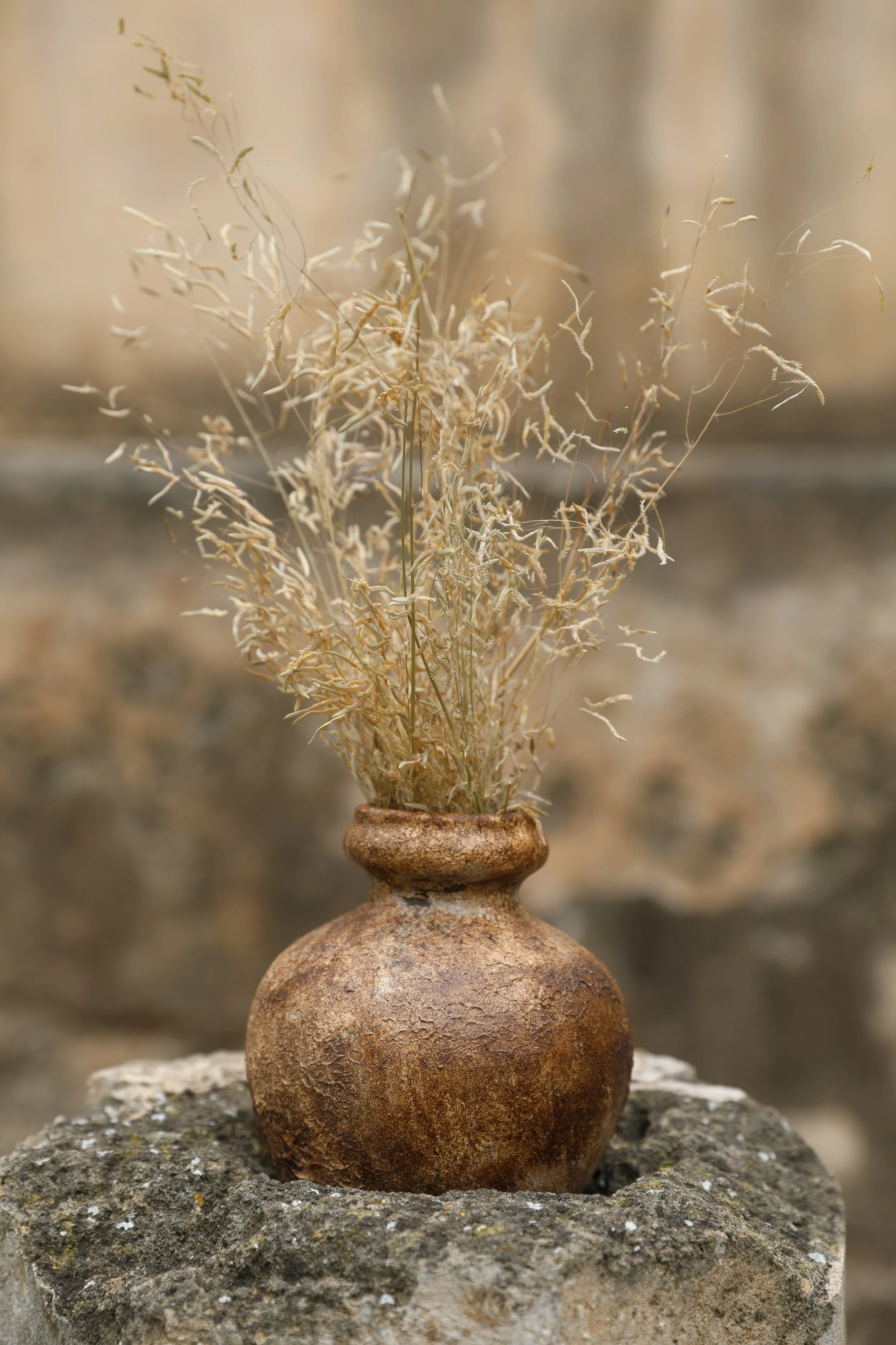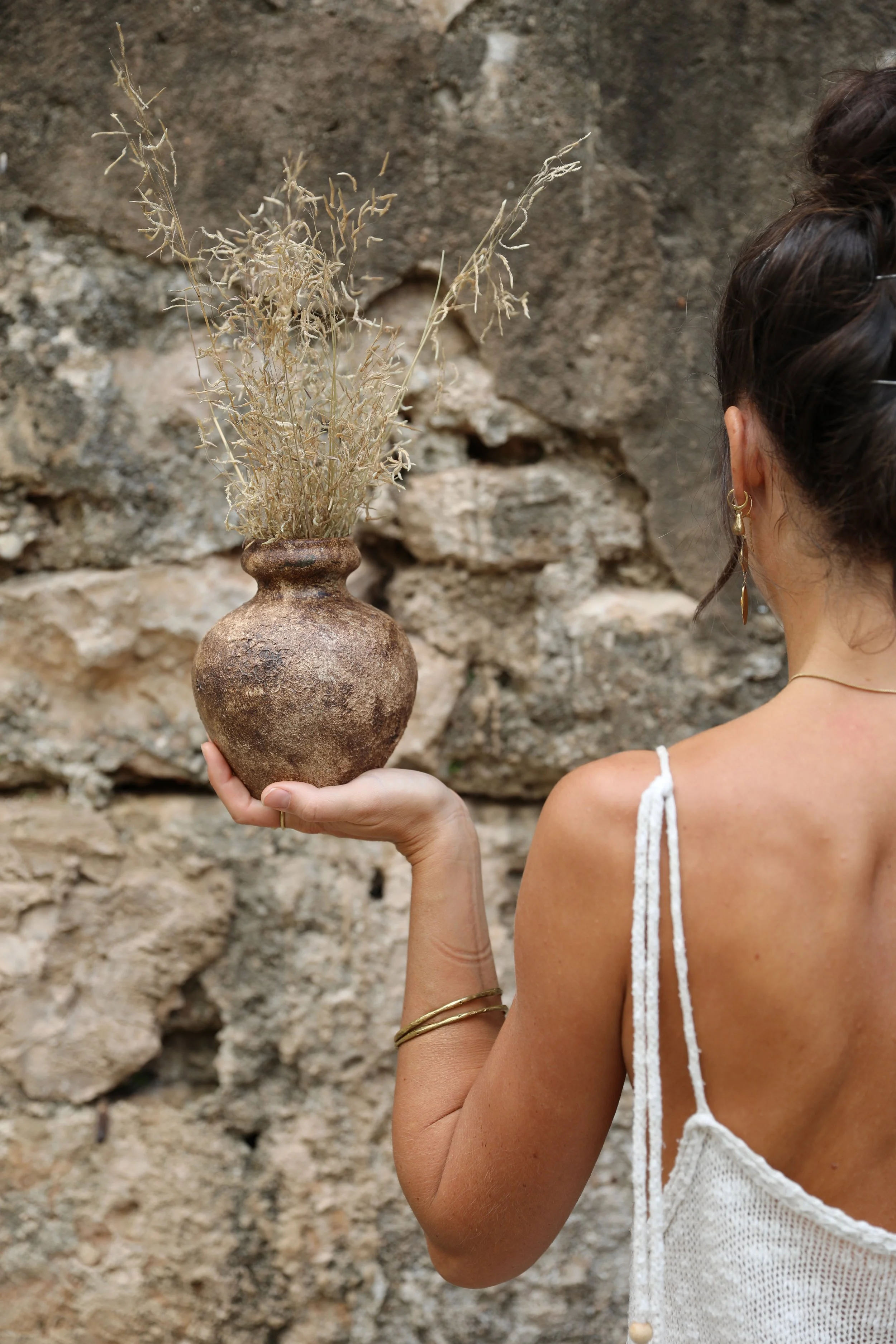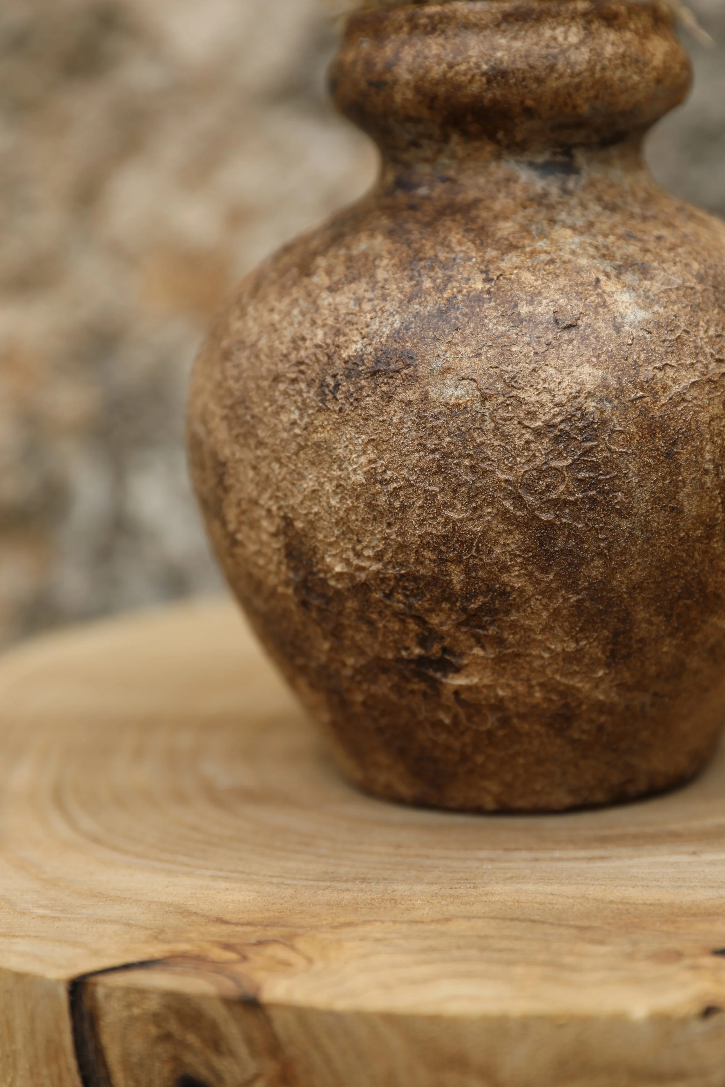 Old vase, originally in earthy green and orange tones by another artist. Beautiful elegant rounded shape. Unique piece. Upcycled with structure paste, sand, natural pigments, worked on by hand and sponge technique.