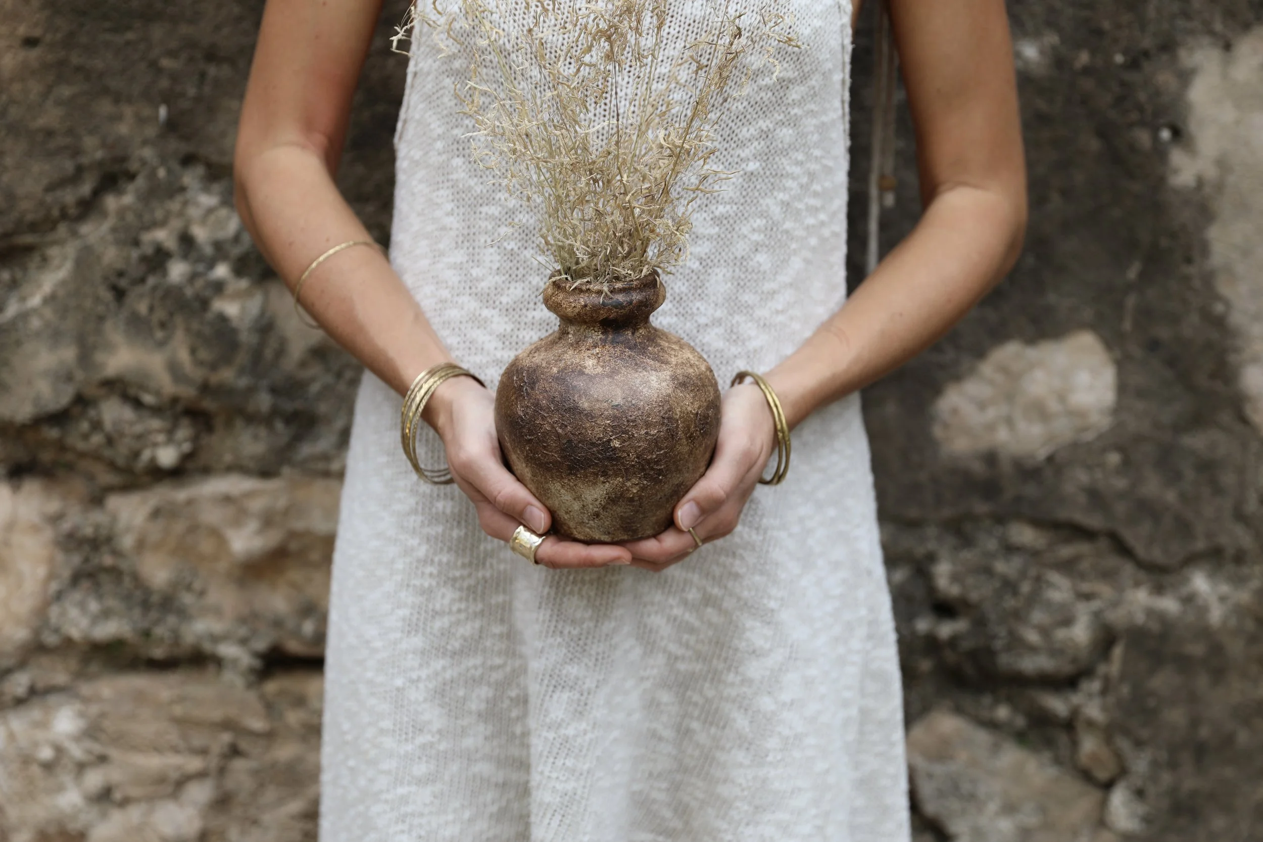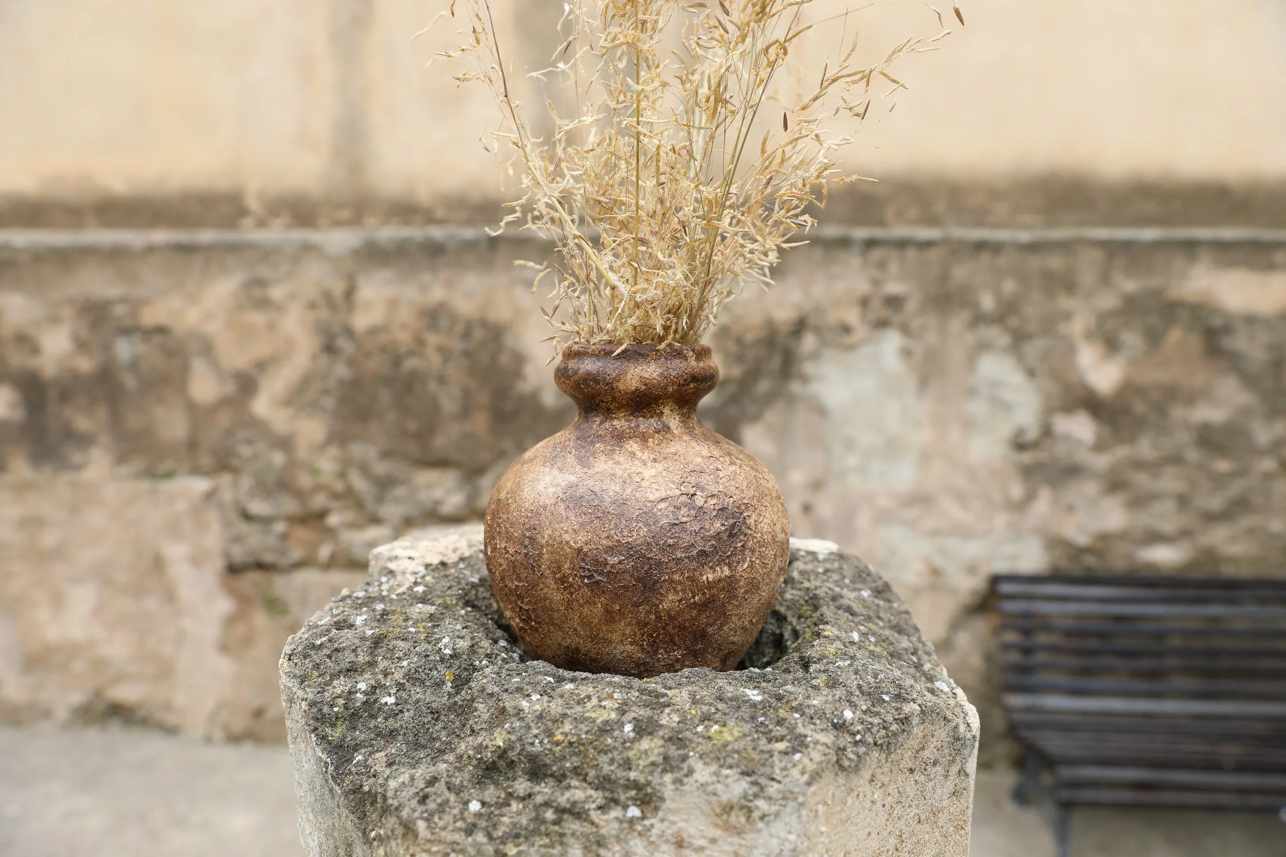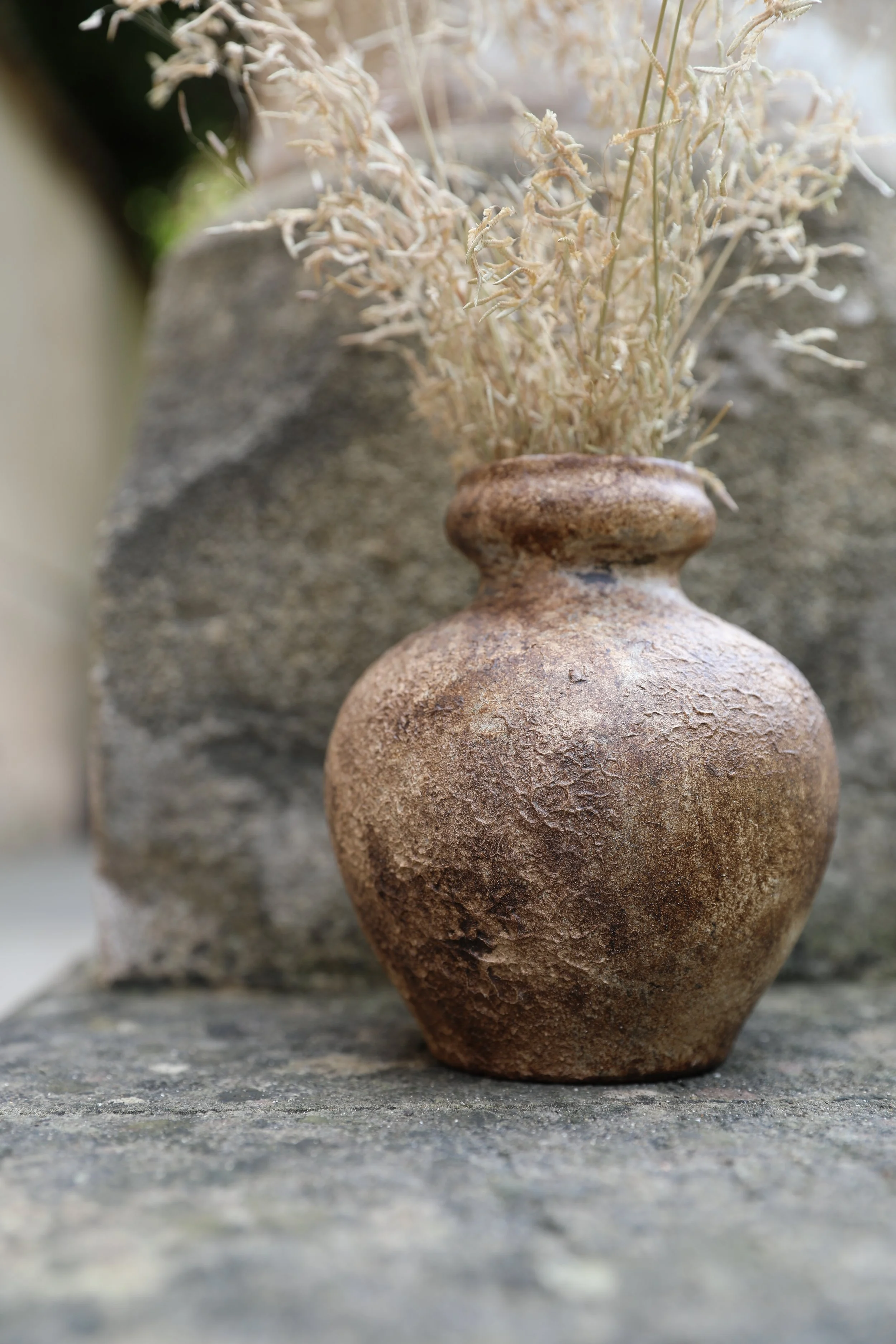 Old vase, originally in earthy green and orange tones by another artist. Beautiful elegant rounded shape. Unique piece. Upcycled with structure paste, sand, natural pigments, worked on by hand and sponge technique.